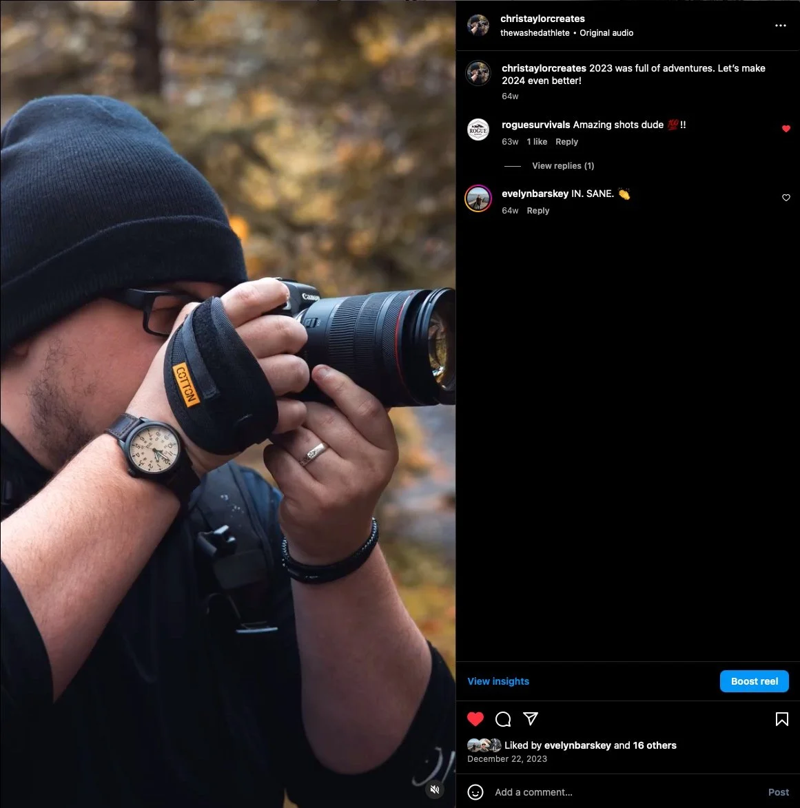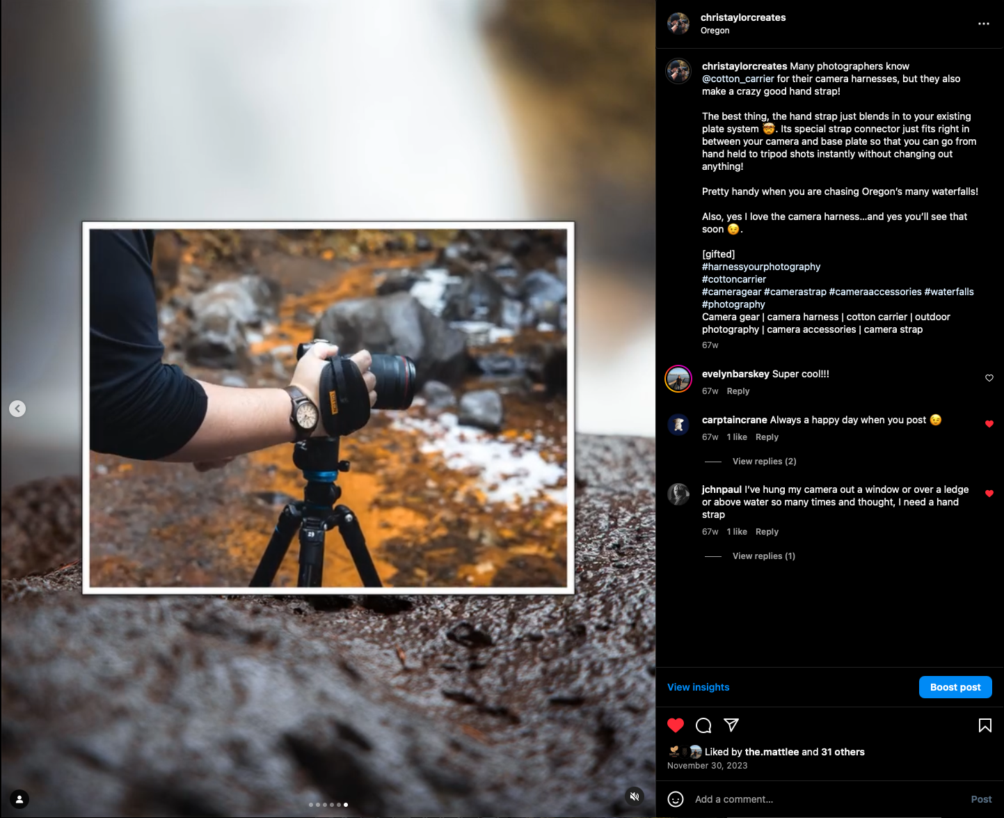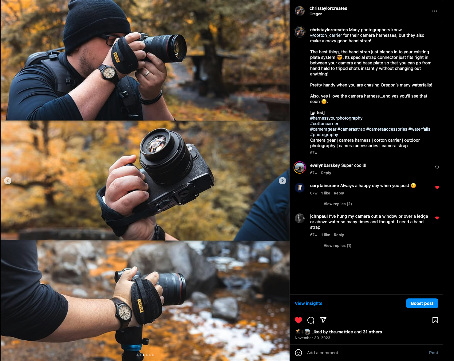COTTON CARRIER is an American family company that focuses on one of a kind products aimed at wildlife and outdoor enthusiasts to help carry large lenses, binoculars, and more. The objective in this project was to create product focused imagery of 2 products, their unique Harness system and Hand Strap, to be used primarily for social media content and for possible website and newsletter content.